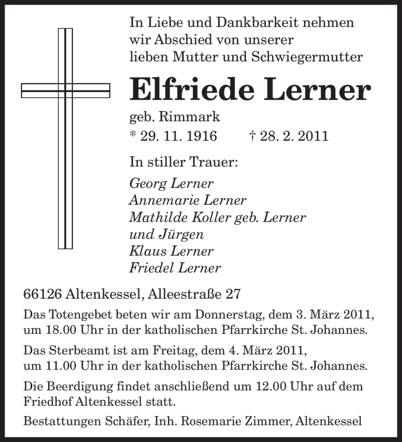 Hier finden Sie alle Traueranzeigen aus der Zeitung, die bisher für Elfriede Lerner erschienen sind. Weitere Traueranzeigen, die in der Zeitung erscheinen, werden hier ebenfalls aufgelistet