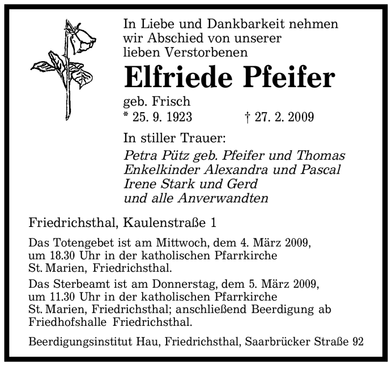 Hier finden Sie alle Traueranzeigen aus der Zeitung, die bisher für Elfriede Pfeifer erschienen sind. Weitere Traueranzeigen, die in der Zeitung erscheinen, werden hier ebenfalls aufgelistet