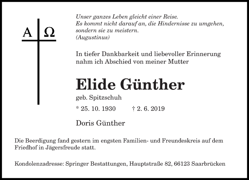 Hier finden Sie alle Traueranzeigen aus der Zeitung, die bisher für Elide Günther erschienen sind. Weitere Traueranzeigen, die in der Zeitung erscheinen, werden hier ebenfalls aufgelistet