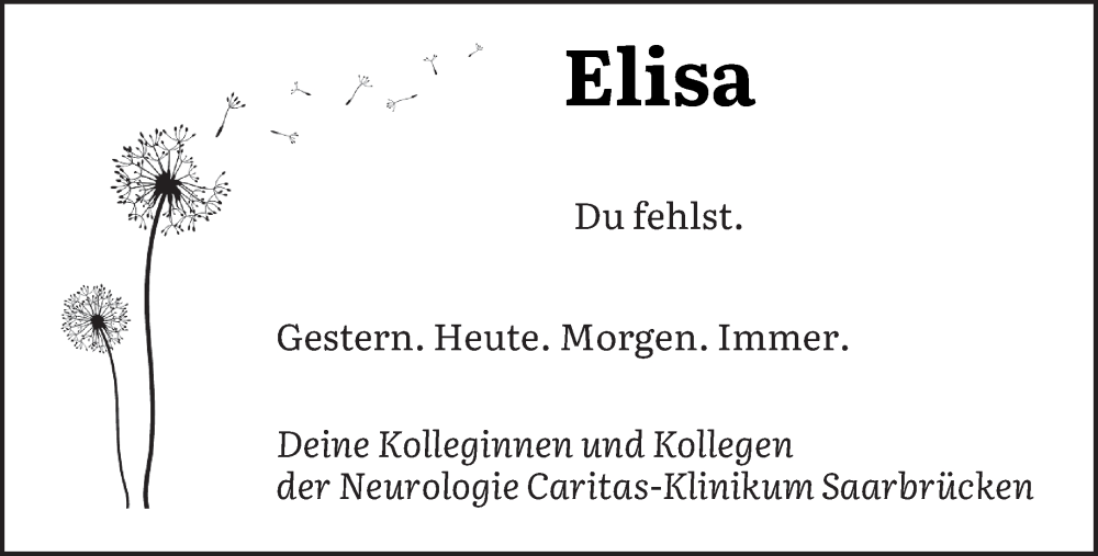 Hier finden Sie alle Traueranzeigen aus der Zeitung, die bisher für Elisa erschienen sind. Weitere Traueranzeigen, die in der Zeitung erscheinen, werden hier ebenfalls aufgelistet