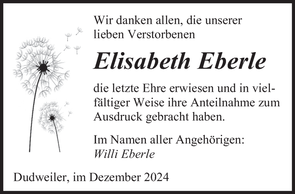 Hier finden Sie alle Traueranzeigen aus der Zeitung, die bisher für Elisabeth Eberle erschienen sind. Weitere Traueranzeigen, die in der Zeitung erscheinen, werden hier ebenfalls aufgelistet