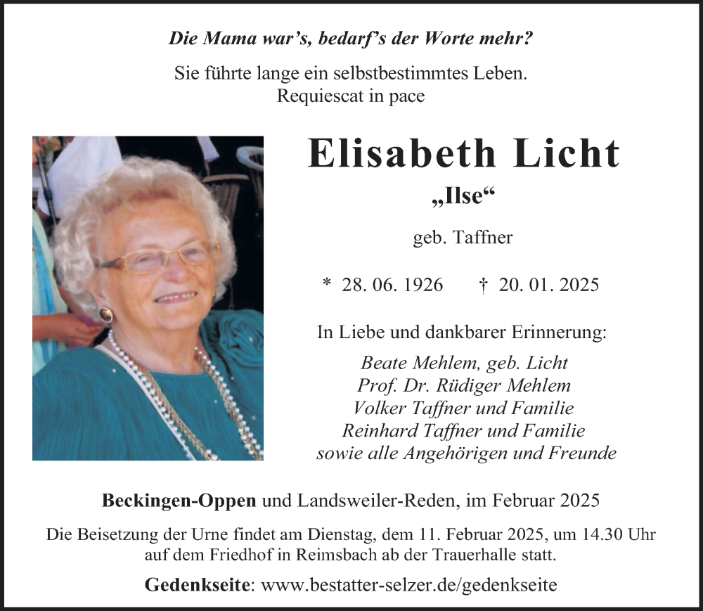 Hier finden Sie alle Traueranzeigen aus der Zeitung, die bisher für Elisabeth Licht erschienen sind. Weitere Traueranzeigen, die in der Zeitung erscheinen, werden hier ebenfalls aufgelistet