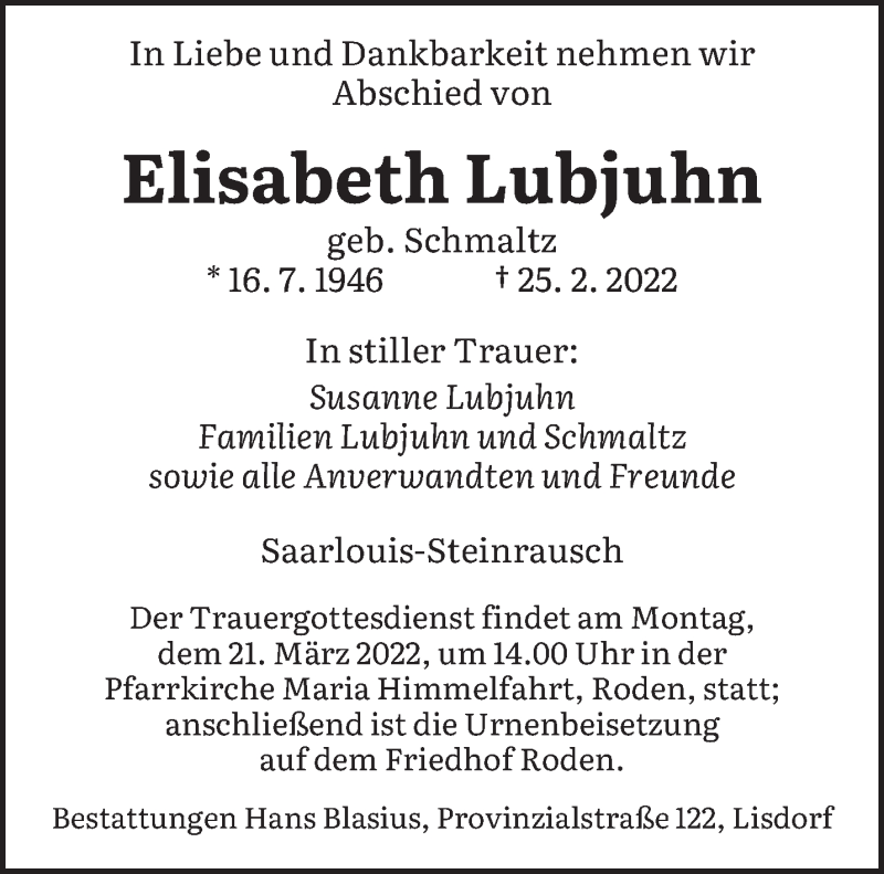 Hier finden Sie alle Traueranzeigen aus der Zeitung, die bisher für Elisabeth Lubjuhn erschienen sind. Weitere Traueranzeigen, die in der Zeitung erscheinen, werden hier ebenfalls aufgelistet