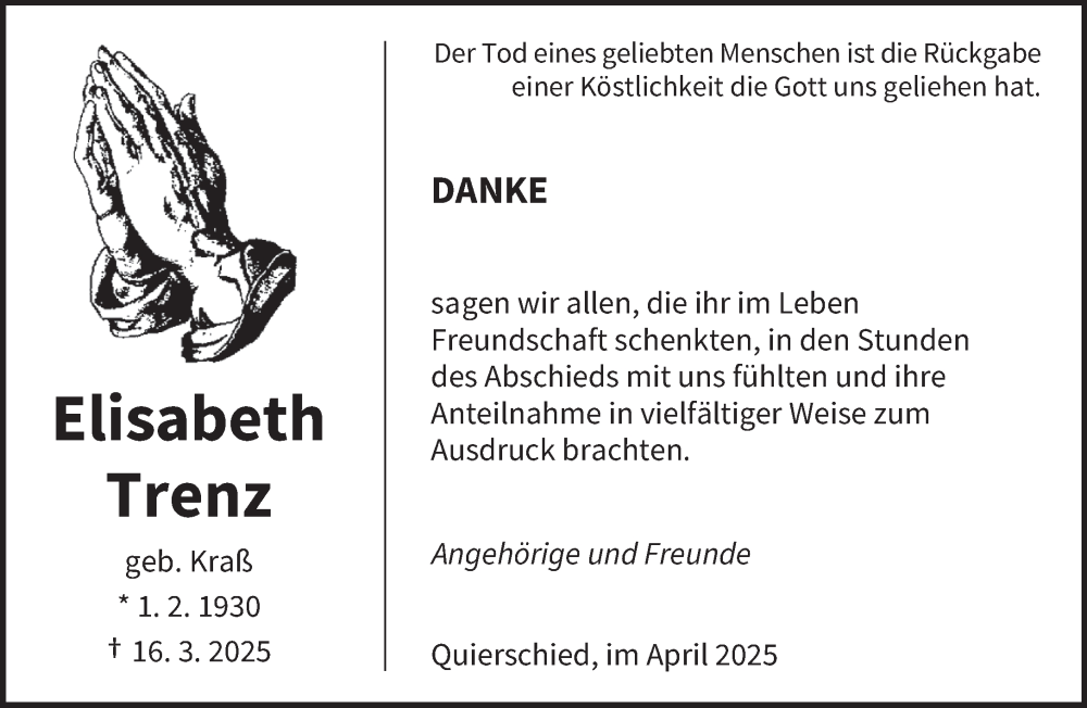 Hier finden Sie alle Traueranzeigen aus der Zeitung, die bisher für Elisabeth Trenz erschienen sind. Weitere Traueranzeigen, die in der Zeitung erscheinen, werden hier ebenfalls aufgelistet