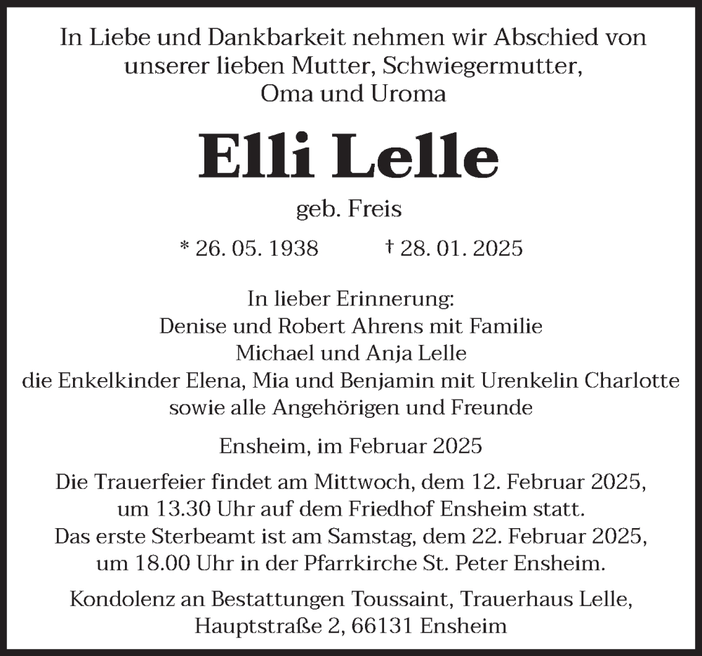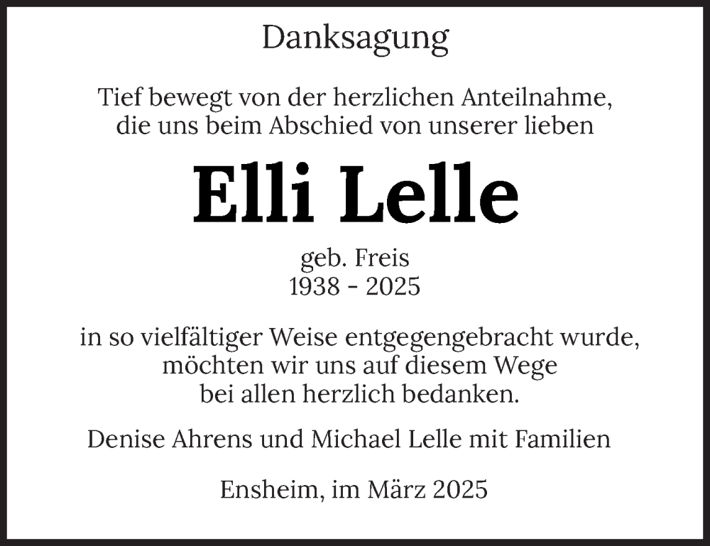 Hier finden Sie alle Traueranzeigen aus der Zeitung, die bisher für Elli Lelle erschienen sind. Weitere Traueranzeigen, die in der Zeitung erscheinen, werden hier ebenfalls aufgelistet