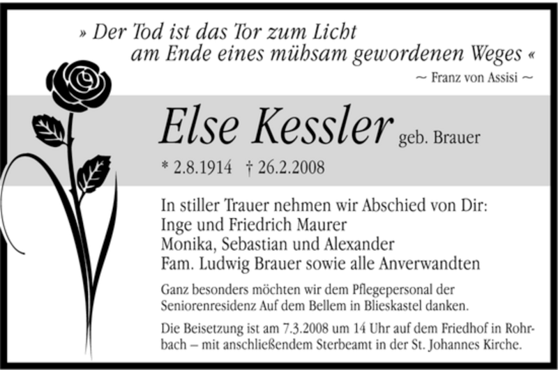 Hier finden Sie alle Traueranzeigen aus der Zeitung, die bisher für Else Kessler erschienen sind. Weitere Traueranzeigen, die in der Zeitung erscheinen, werden hier ebenfalls aufgelistet