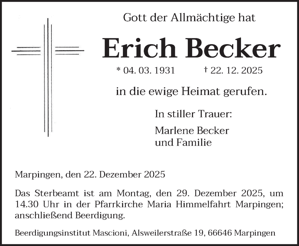 Hier finden Sie alle Traueranzeigen aus der Zeitung, die bisher für Erich Becker erschienen sind. Weitere Traueranzeigen, die in der Zeitung erscheinen, werden hier ebenfalls aufgelistet