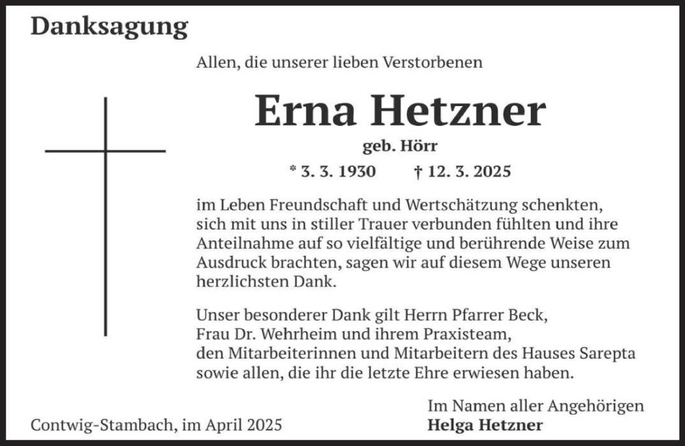 Hier finden Sie alle Traueranzeigen aus der Zeitung, die bisher für Erna Hetzner erschienen sind. Weitere Traueranzeigen, die in der Zeitung erscheinen, werden hier ebenfalls aufgelistet