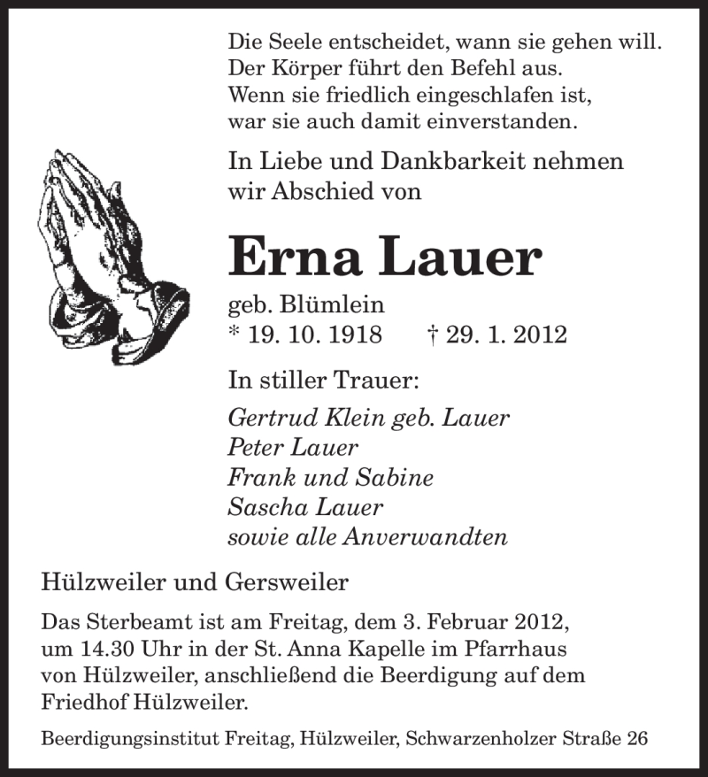 Hier finden Sie alle Traueranzeigen aus der Zeitung, die bisher für Erna Lauer erschienen sind. Weitere Traueranzeigen, die in der Zeitung erscheinen, werden hier ebenfalls aufgelistet
