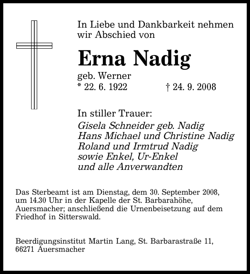 Hier finden Sie alle Traueranzeigen aus der Zeitung, die bisher für Erna Nadig erschienen sind. Weitere Traueranzeigen, die in der Zeitung erscheinen, werden hier ebenfalls aufgelistet