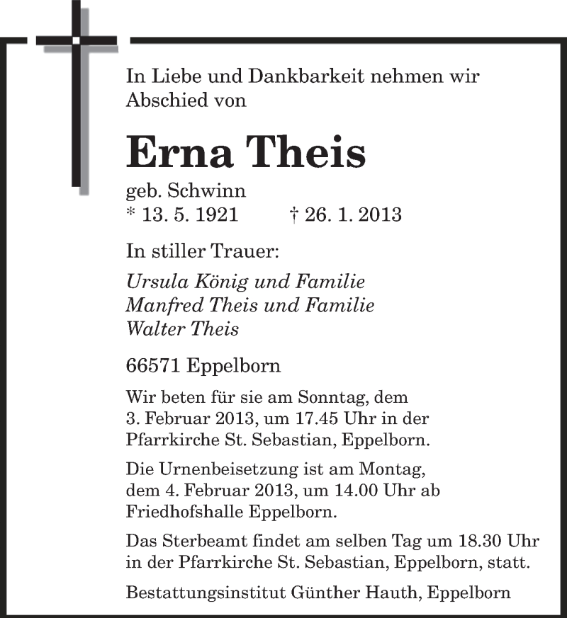 Hier finden Sie alle Traueranzeigen aus der Zeitung, die bisher für Erna Theis erschienen sind. Weitere Traueranzeigen, die in der Zeitung erscheinen, werden hier ebenfalls aufgelistet