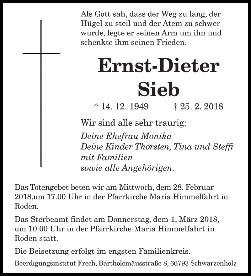 Hier finden Sie alle Traueranzeigen aus der Zeitung, die bisher für Ernst-Dieter Sieb erschienen sind. Weitere Traueranzeigen, die in der Zeitung erscheinen, werden hier ebenfalls aufgelistet