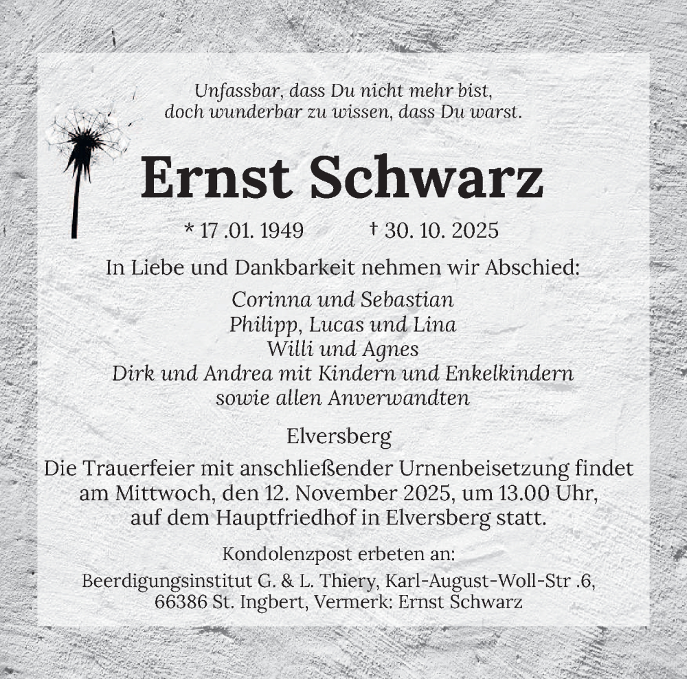 Hier finden Sie alle Traueranzeigen aus der Zeitung, die bisher für Ernst Schwarz erschienen sind. Weitere Traueranzeigen, die in der Zeitung erscheinen, werden hier ebenfalls aufgelistet