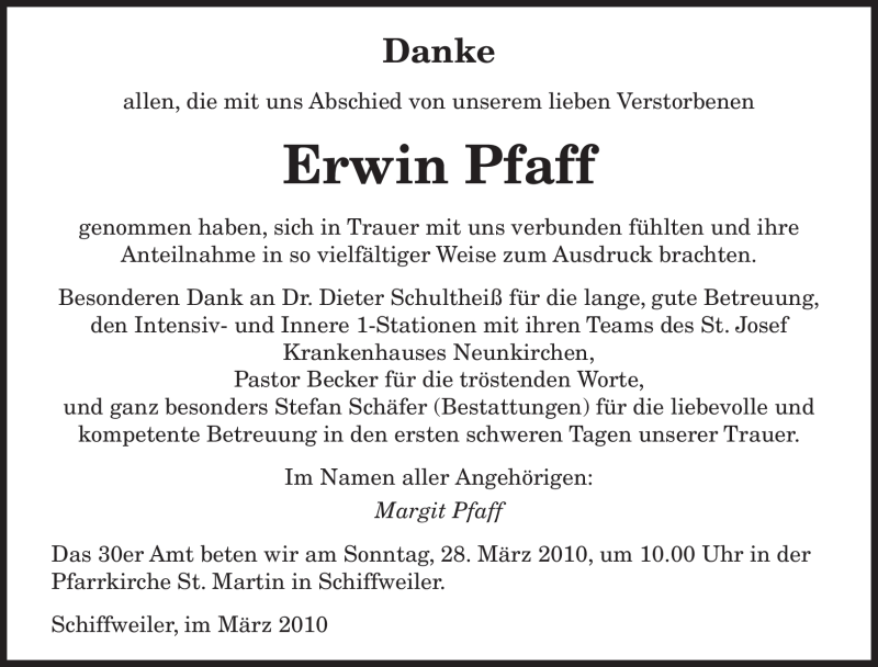 Hier finden Sie alle Traueranzeigen aus der Zeitung, die bisher für Erwin Pfaff erschienen sind. Weitere Traueranzeigen, die in der Zeitung erscheinen, werden hier ebenfalls aufgelistet