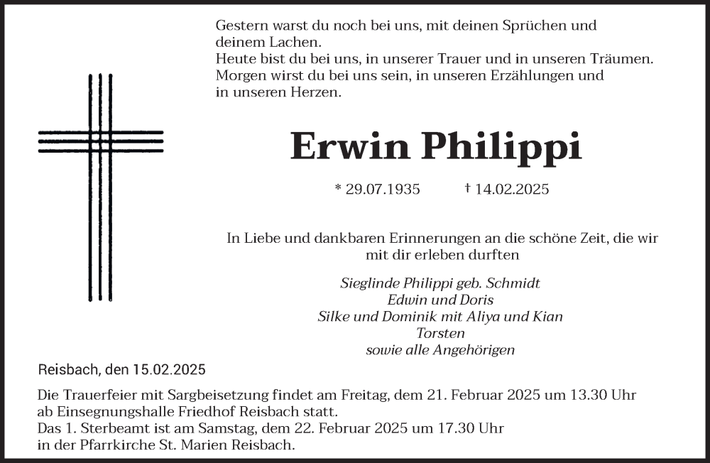 Hier finden Sie alle Traueranzeigen aus der Zeitung, die bisher für Erwin Philippi erschienen sind. Weitere Traueranzeigen, die in der Zeitung erscheinen, werden hier ebenfalls aufgelistet
