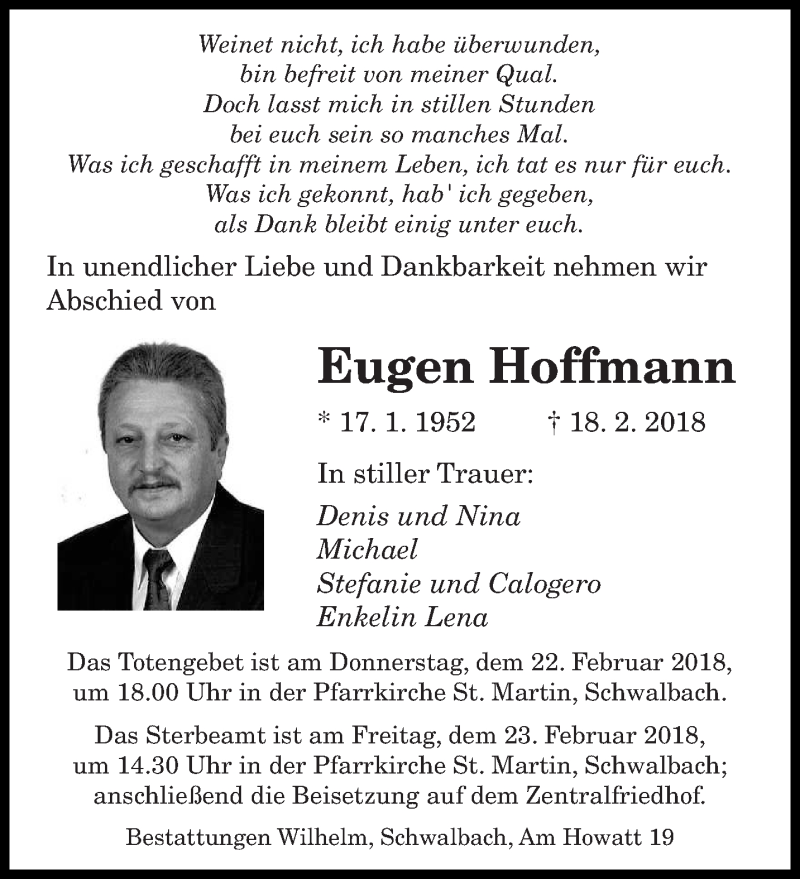 Hier finden Sie alle Traueranzeigen aus der Zeitung, die bisher für Eugen Hoffmann erschienen sind. Weitere Traueranzeigen, die in der Zeitung erscheinen, werden hier ebenfalls aufgelistet