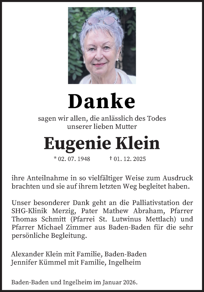 Hier finden Sie alle Traueranzeigen aus der Zeitung, die bisher für Eugenie Klein erschienen sind. Weitere Traueranzeigen, die in der Zeitung erscheinen, werden hier ebenfalls aufgelistet