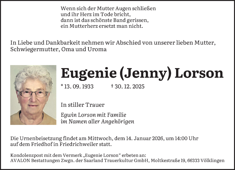 Hier finden Sie alle Traueranzeigen aus der Zeitung, die bisher für Eugenie Lorson erschienen sind. Weitere Traueranzeigen, die in der Zeitung erscheinen, werden hier ebenfalls aufgelistet