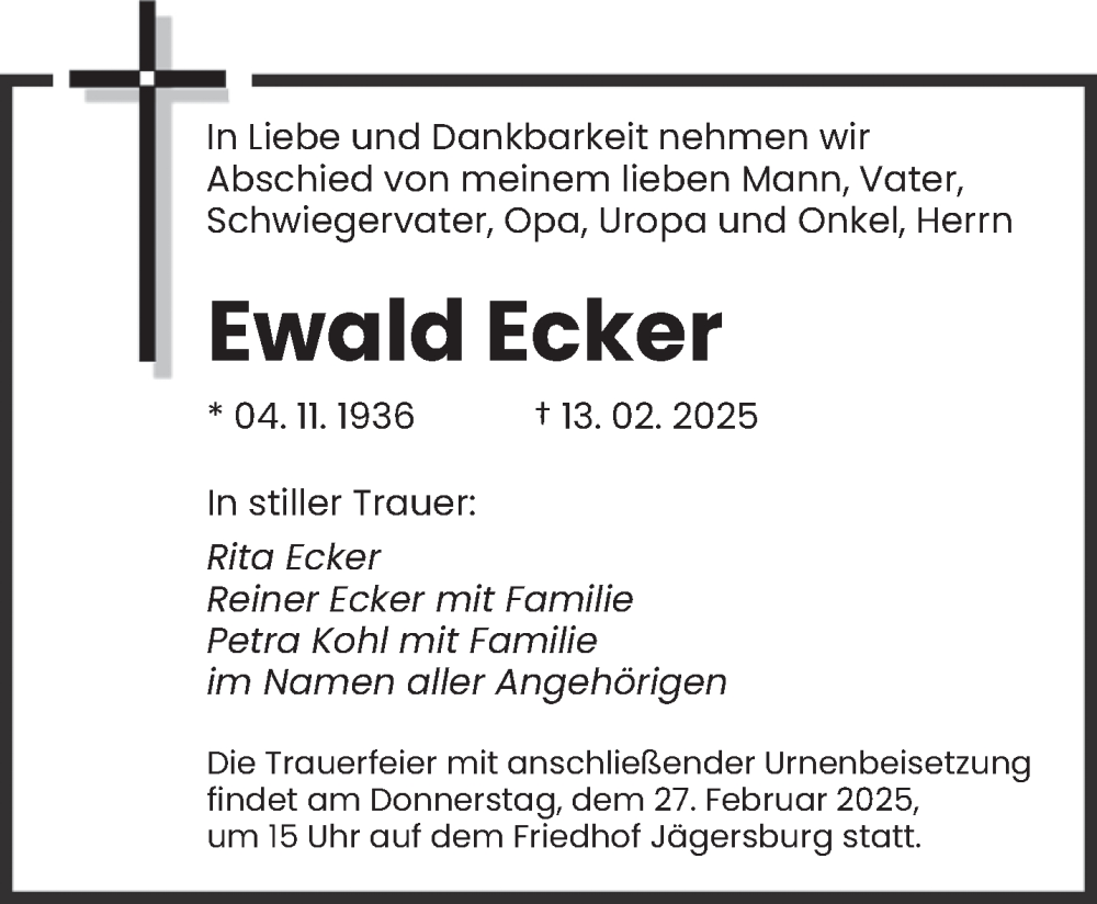 Hier finden Sie alle Traueranzeigen aus der Zeitung, die bisher für Ewald Ecker erschienen sind. Weitere Traueranzeigen, die in der Zeitung erscheinen, werden hier ebenfalls aufgelistet