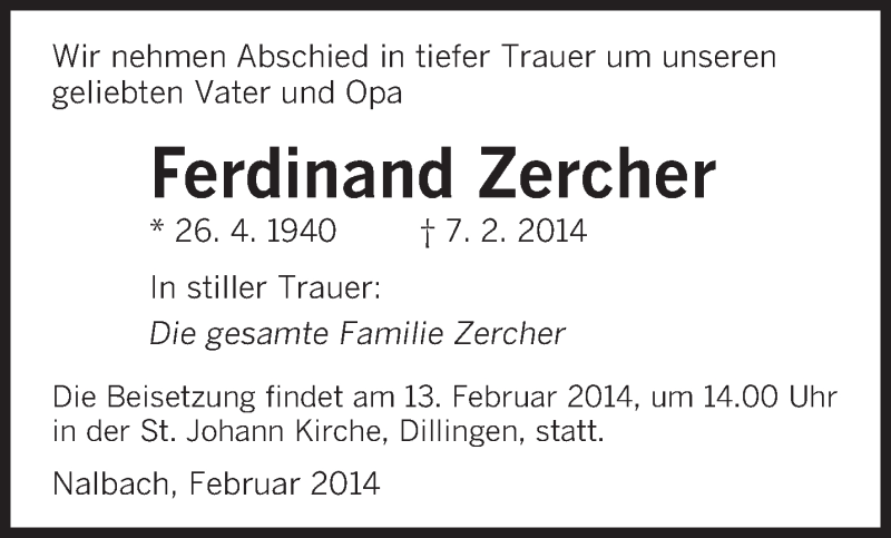 Hier finden Sie alle Traueranzeigen aus der Zeitung, die bisher für Ferdinand Zercher erschienen sind. Weitere Traueranzeigen, die in der Zeitung erscheinen, werden hier ebenfalls aufgelistet