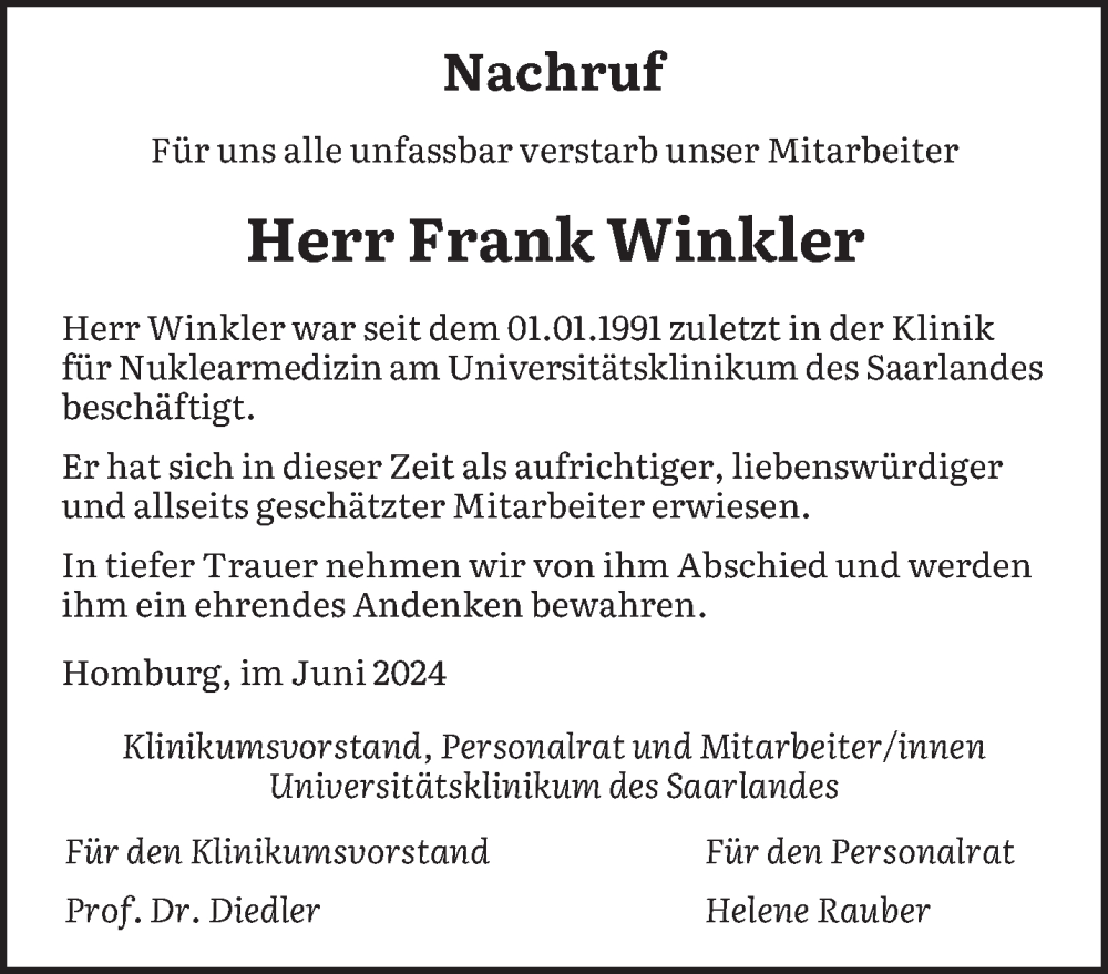 Hier finden Sie alle Traueranzeigen aus der Zeitung, die bisher für Frank Winkler erschienen sind. Weitere Traueranzeigen, die in der Zeitung erscheinen, werden hier ebenfalls aufgelistet