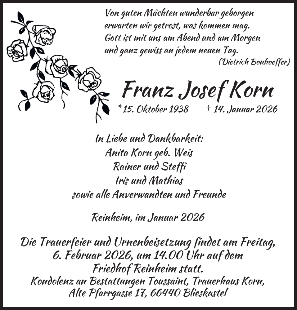 Hier finden Sie alle Traueranzeigen aus der Zeitung, die bisher für Franz Josef Korn erschienen sind. Weitere Traueranzeigen, die in der Zeitung erscheinen, werden hier ebenfalls aufgelistet