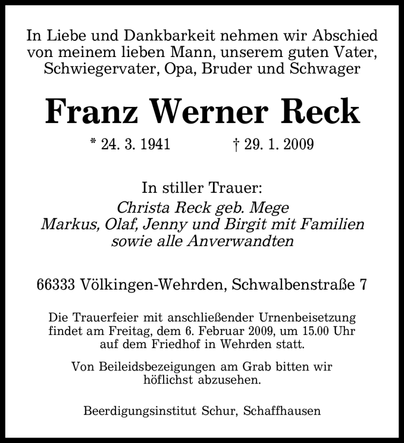 Hier finden Sie alle Traueranzeigen aus der Zeitung, die bisher für Franz Werner Reck erschienen sind. Weitere Traueranzeigen, die in der Zeitung erscheinen, werden hier ebenfalls aufgelistet