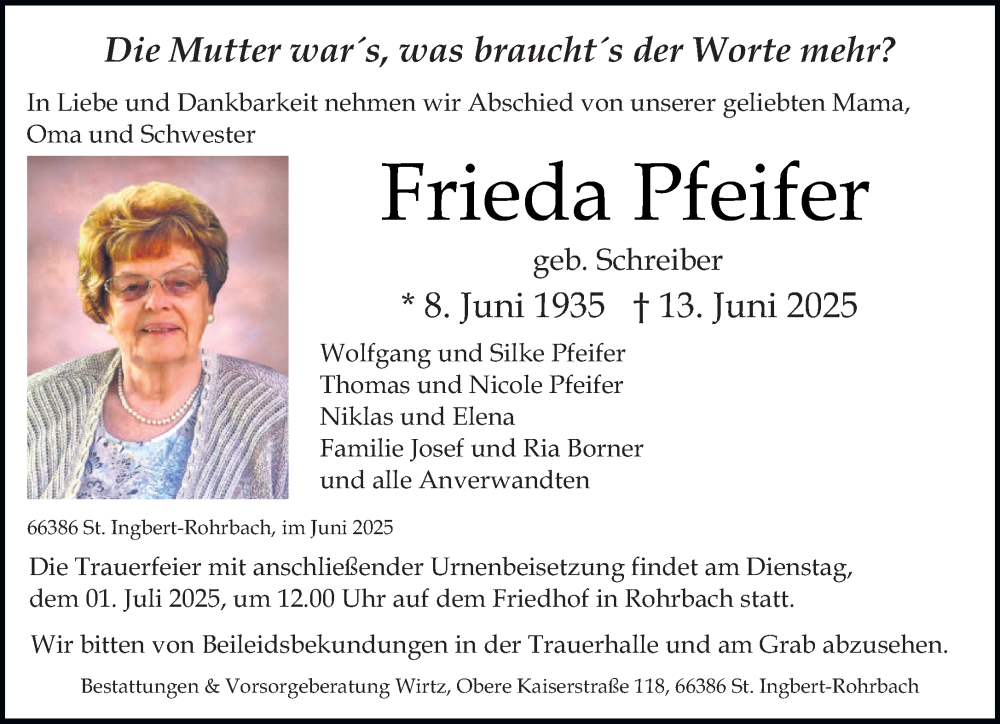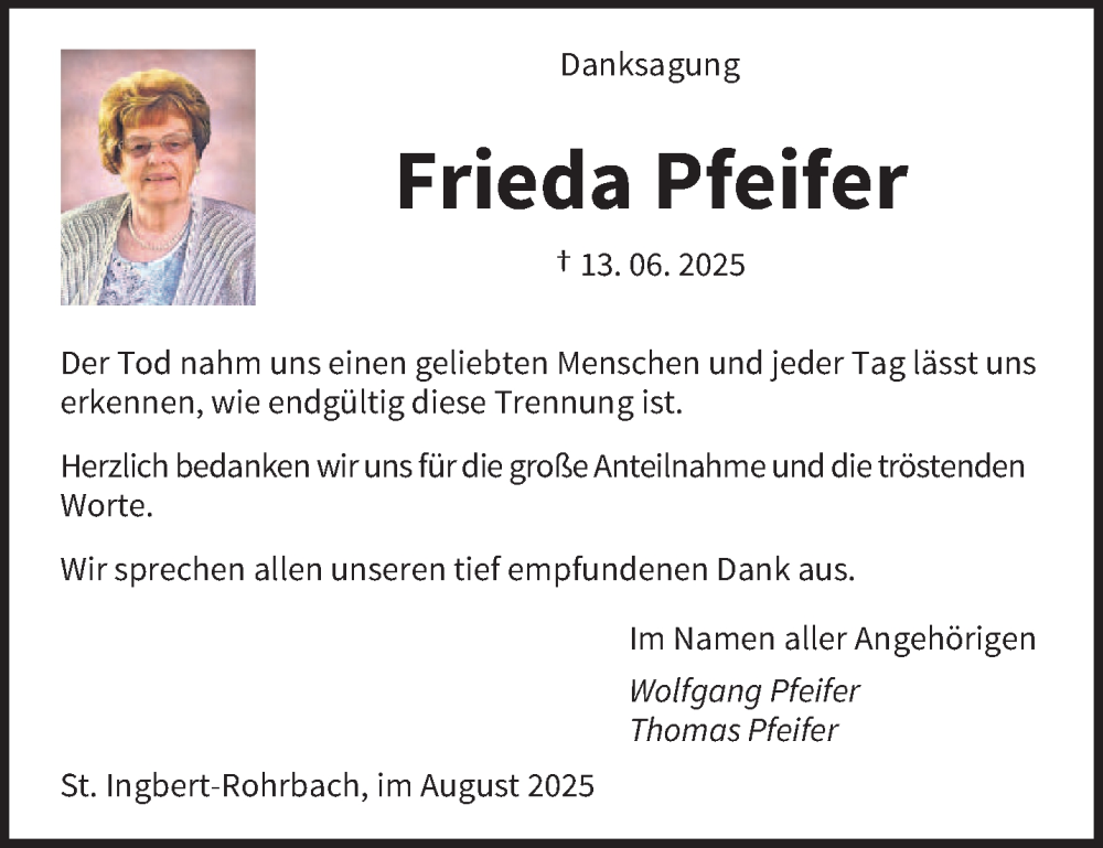 Hier finden Sie alle Traueranzeigen aus der Zeitung, die bisher für Frieda Pfeifer erschienen sind. Weitere Traueranzeigen, die in der Zeitung erscheinen, werden hier ebenfalls aufgelistet
