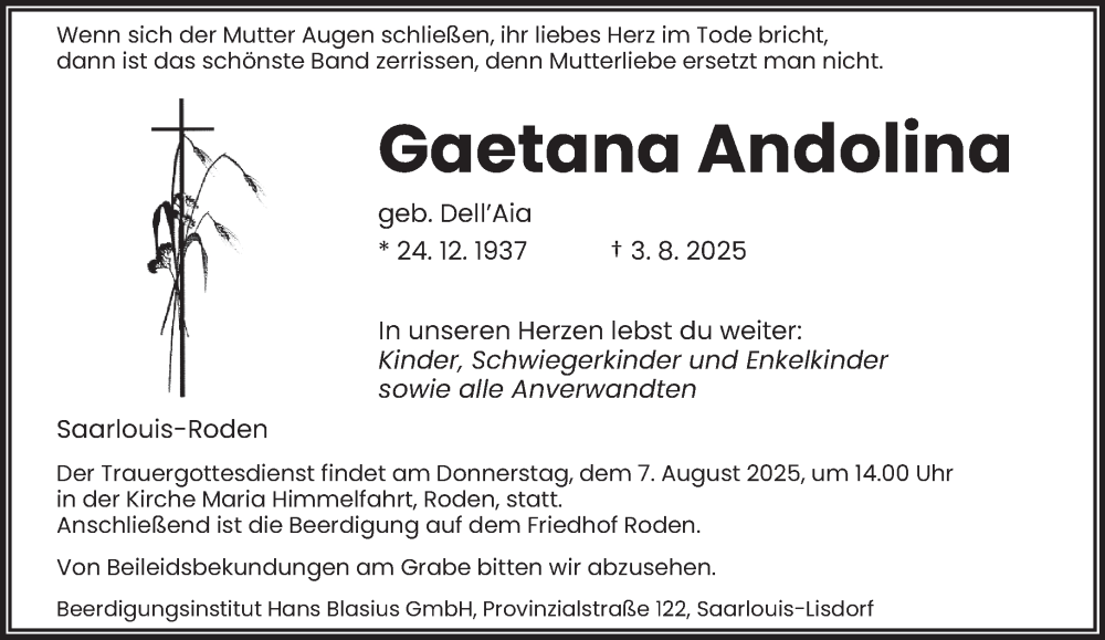 Hier finden Sie alle Traueranzeigen aus der Zeitung, die bisher für Gaetana Andolina erschienen sind. Weitere Traueranzeigen, die in der Zeitung erscheinen, werden hier ebenfalls aufgelistet