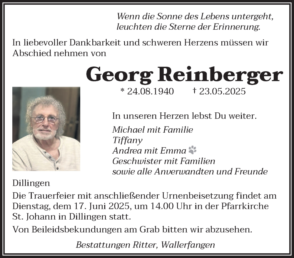 Hier finden Sie alle Traueranzeigen aus der Zeitung, die bisher für Georg Reinberger erschienen sind. Weitere Traueranzeigen, die in der Zeitung erscheinen, werden hier ebenfalls aufgelistet
