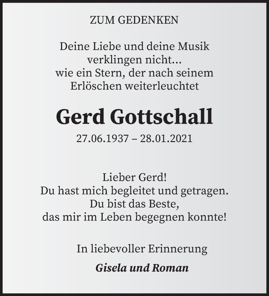 Hier finden Sie alle Traueranzeigen aus der Zeitung, die bisher für Gerd Gottschall erschienen sind. Weitere Traueranzeigen, die in der Zeitung erscheinen, werden hier ebenfalls aufgelistet