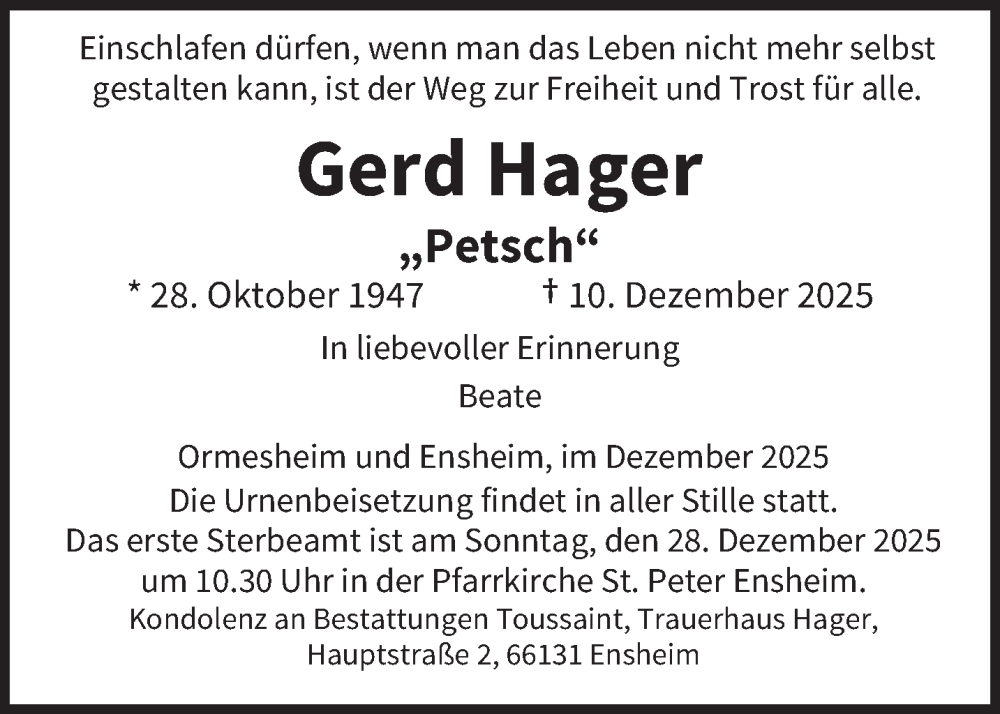 Hier finden Sie alle Traueranzeigen aus der Zeitung, die bisher für Gerd Hager erschienen sind. Weitere Traueranzeigen, die in der Zeitung erscheinen, werden hier ebenfalls aufgelistet