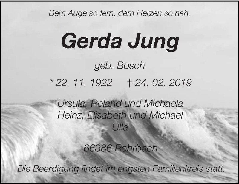 Hier finden Sie alle Traueranzeigen aus der Zeitung, die bisher für Gerda Jung erschienen sind. Weitere Traueranzeigen, die in der Zeitung erscheinen, werden hier ebenfalls aufgelistet