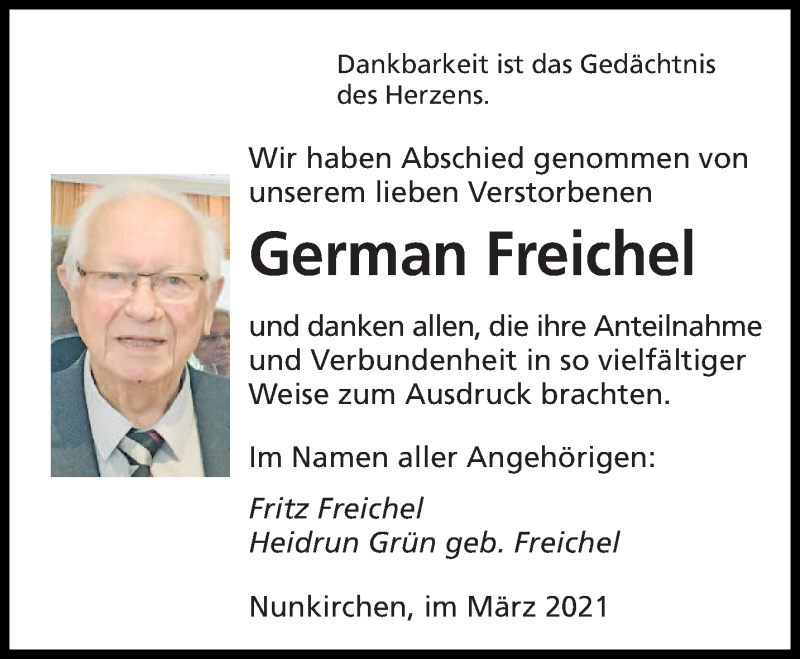 Hier finden Sie alle Traueranzeigen aus der Zeitung, die bisher für German Freichel erschienen sind. Weitere Traueranzeigen, die in der Zeitung erscheinen, werden hier ebenfalls aufgelistet