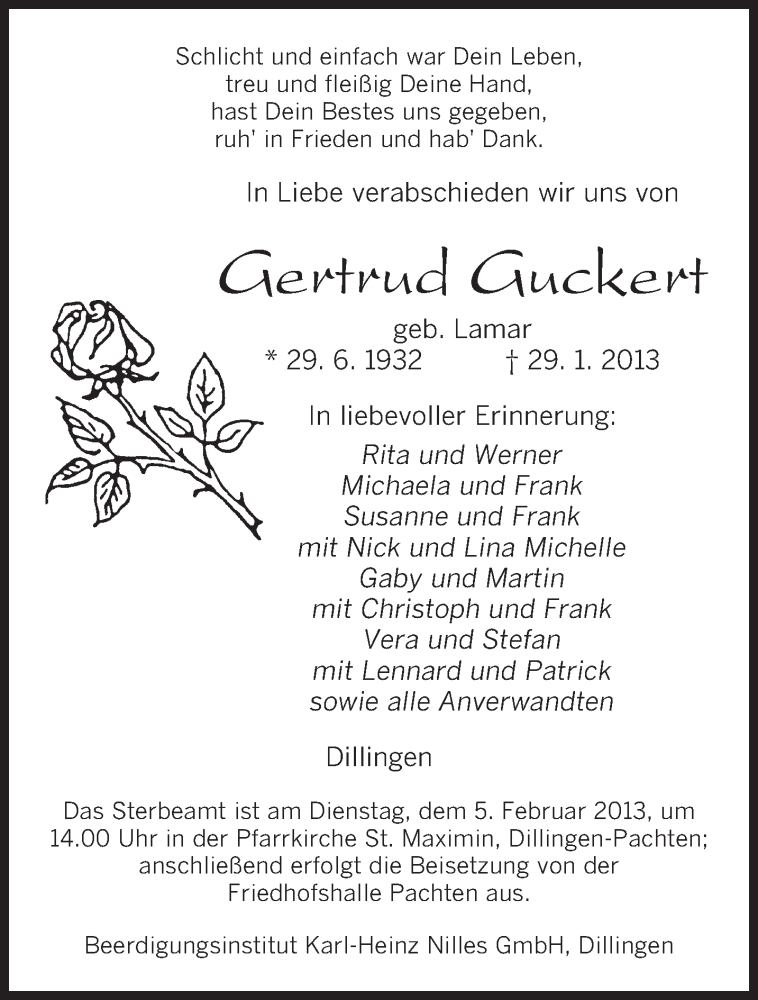 Hier finden Sie alle Traueranzeigen aus der Zeitung, die bisher für Gertrud Guckert erschienen sind. Weitere Traueranzeigen, die in der Zeitung erscheinen, werden hier ebenfalls aufgelistet
