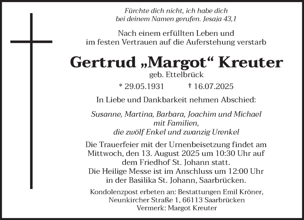 Hier finden Sie alle Traueranzeigen aus der Zeitung, die bisher für Gertrud Kreuter erschienen sind. Weitere Traueranzeigen, die in der Zeitung erscheinen, werden hier ebenfalls aufgelistet