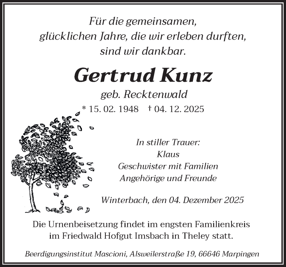 Hier finden Sie alle Traueranzeigen aus der Zeitung, die bisher für Gertrud Kunz erschienen sind. Weitere Traueranzeigen, die in der Zeitung erscheinen, werden hier ebenfalls aufgelistet