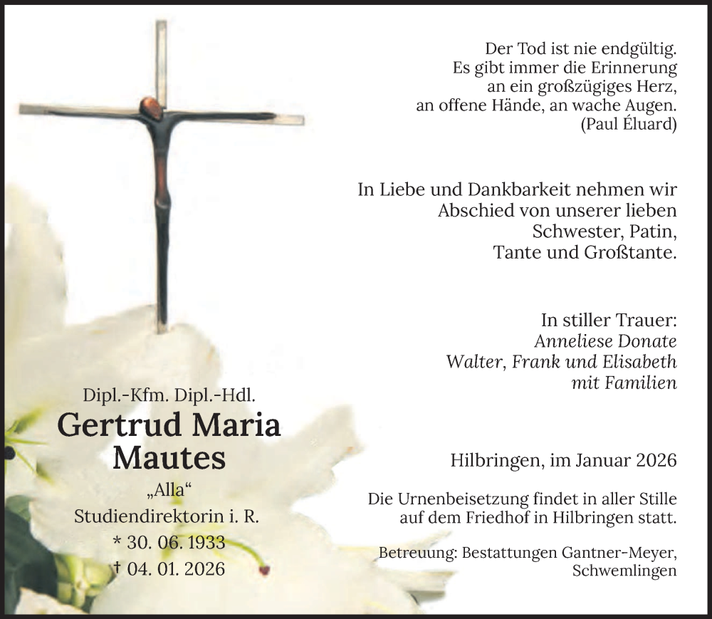 Hier finden Sie alle Traueranzeigen aus der Zeitung, die bisher für Gertrud Maria Mautes erschienen sind. Weitere Traueranzeigen, die in der Zeitung erscheinen, werden hier ebenfalls aufgelistet