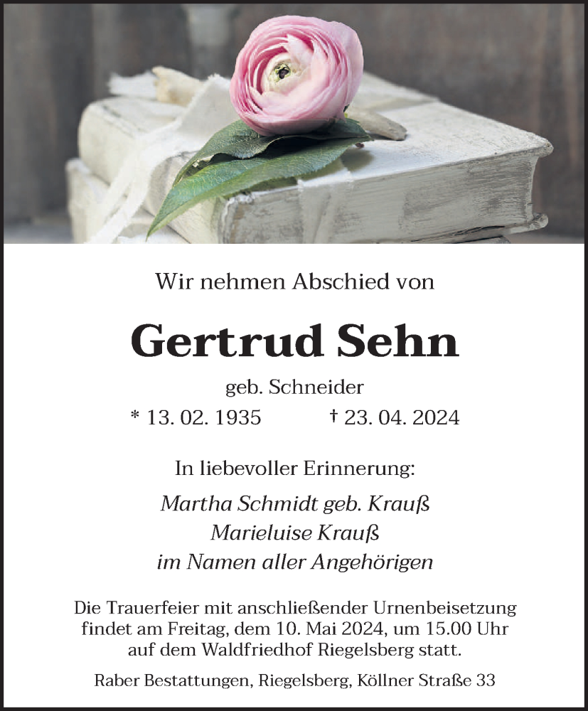 Hier finden Sie alle Traueranzeigen aus der Zeitung, die bisher für Gertrud Sehn erschienen sind. Weitere Traueranzeigen, die in der Zeitung erscheinen, werden hier ebenfalls aufgelistet
