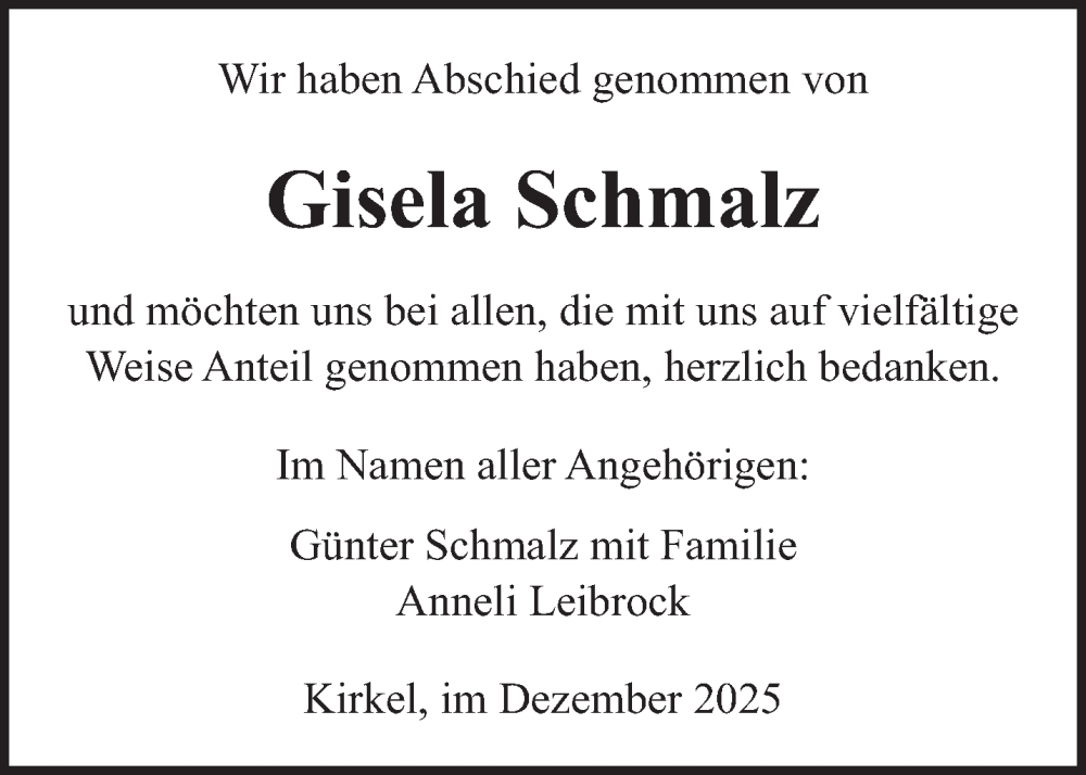 Hier finden Sie alle Traueranzeigen aus der Zeitung, die bisher für Gisela Schmalz erschienen sind. Weitere Traueranzeigen, die in der Zeitung erscheinen, werden hier ebenfalls aufgelistet