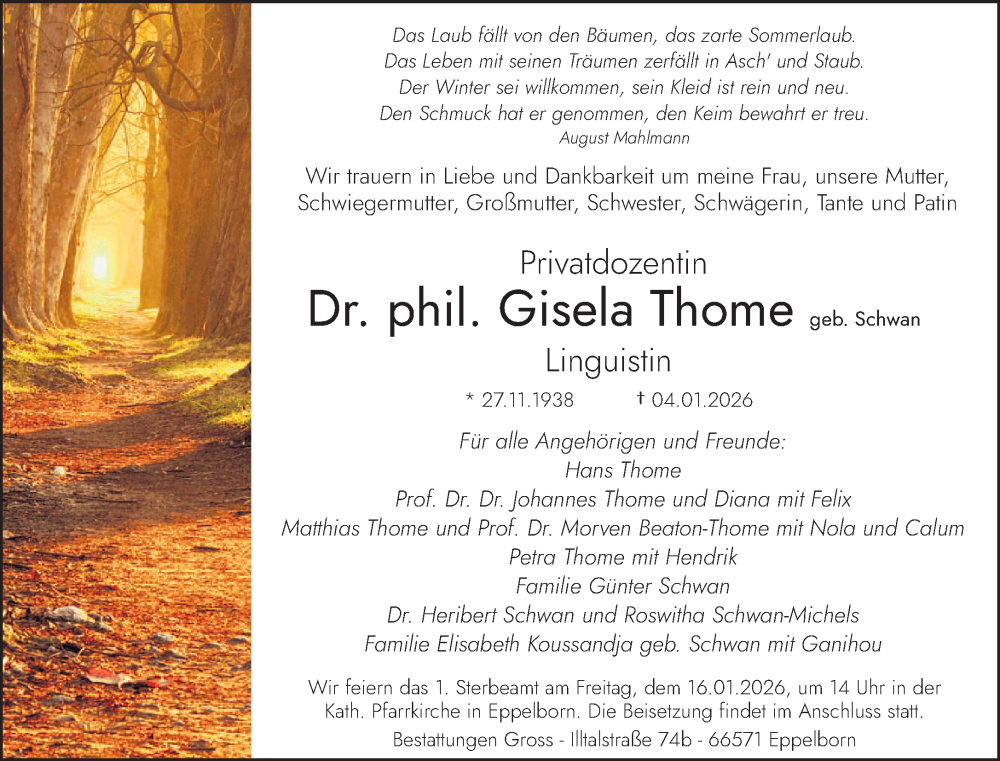 Hier finden Sie alle Traueranzeigen aus der Zeitung, die bisher für Gisela Thome erschienen sind. Weitere Traueranzeigen, die in der Zeitung erscheinen, werden hier ebenfalls aufgelistet