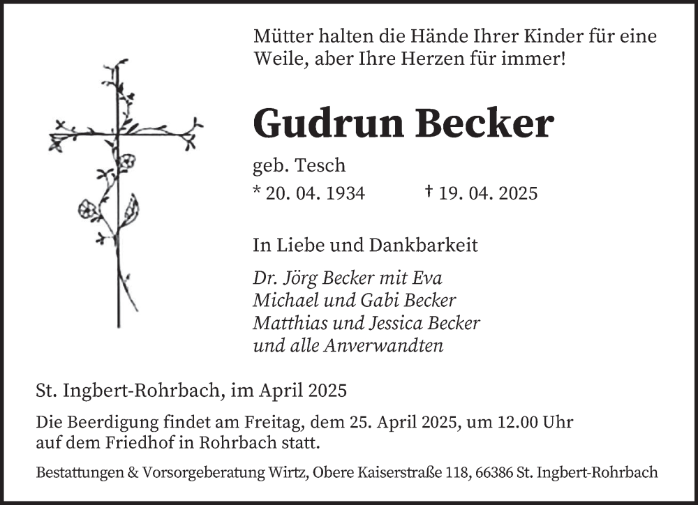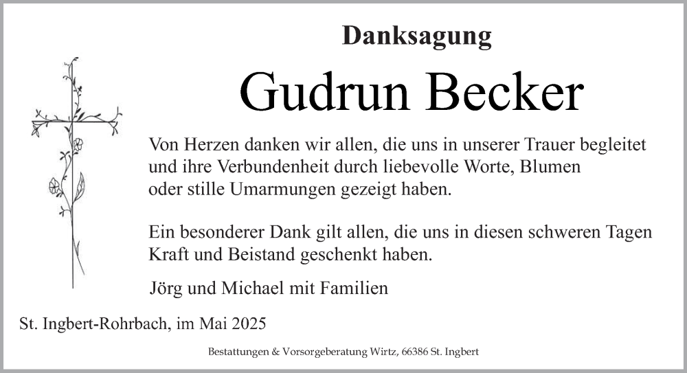 Hier finden Sie alle Traueranzeigen aus der Zeitung, die bisher für Gudrun Becker erschienen sind. Weitere Traueranzeigen, die in der Zeitung erscheinen, werden hier ebenfalls aufgelistet