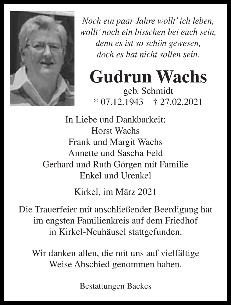 Hier finden Sie alle Traueranzeigen aus der Zeitung, die bisher für Gudrun Wachs erschienen sind. Weitere Traueranzeigen, die in der Zeitung erscheinen, werden hier ebenfalls aufgelistet