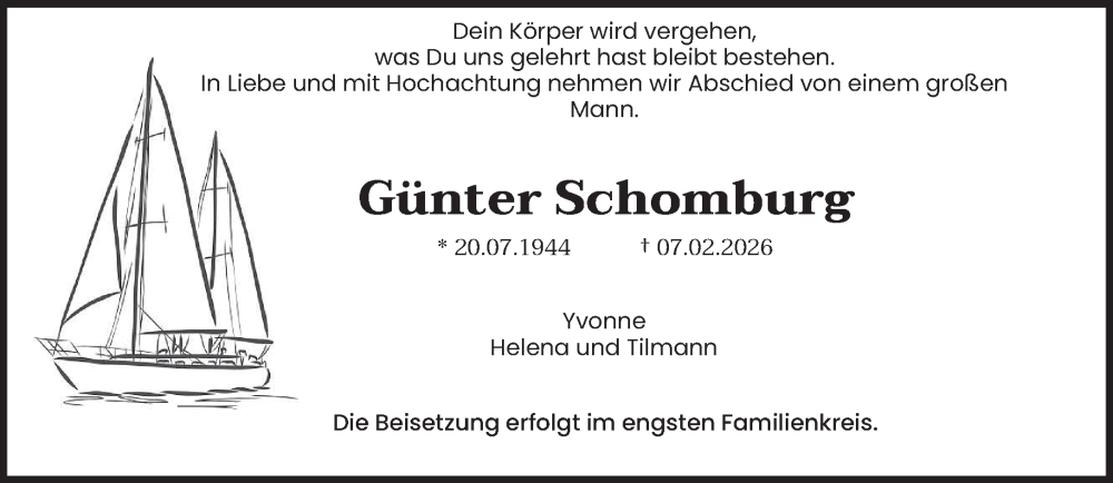 Hier finden Sie alle Traueranzeigen aus der Zeitung, die bisher für Günter Schomburg erschienen sind. Weitere Traueranzeigen, die in der Zeitung erscheinen, werden hier ebenfalls aufgelistet