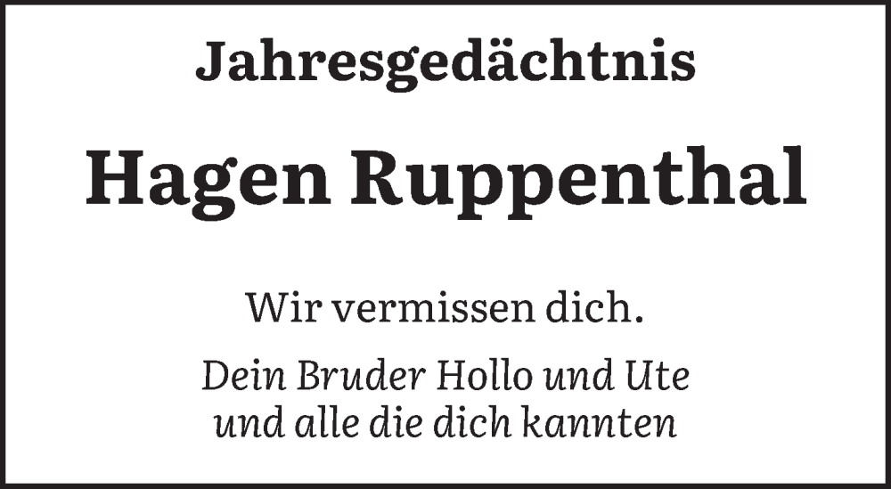 Hier finden Sie alle Traueranzeigen aus der Zeitung, die bisher für Hagen Ruppenthal erschienen sind. Weitere Traueranzeigen, die in der Zeitung erscheinen, werden hier ebenfalls aufgelistet