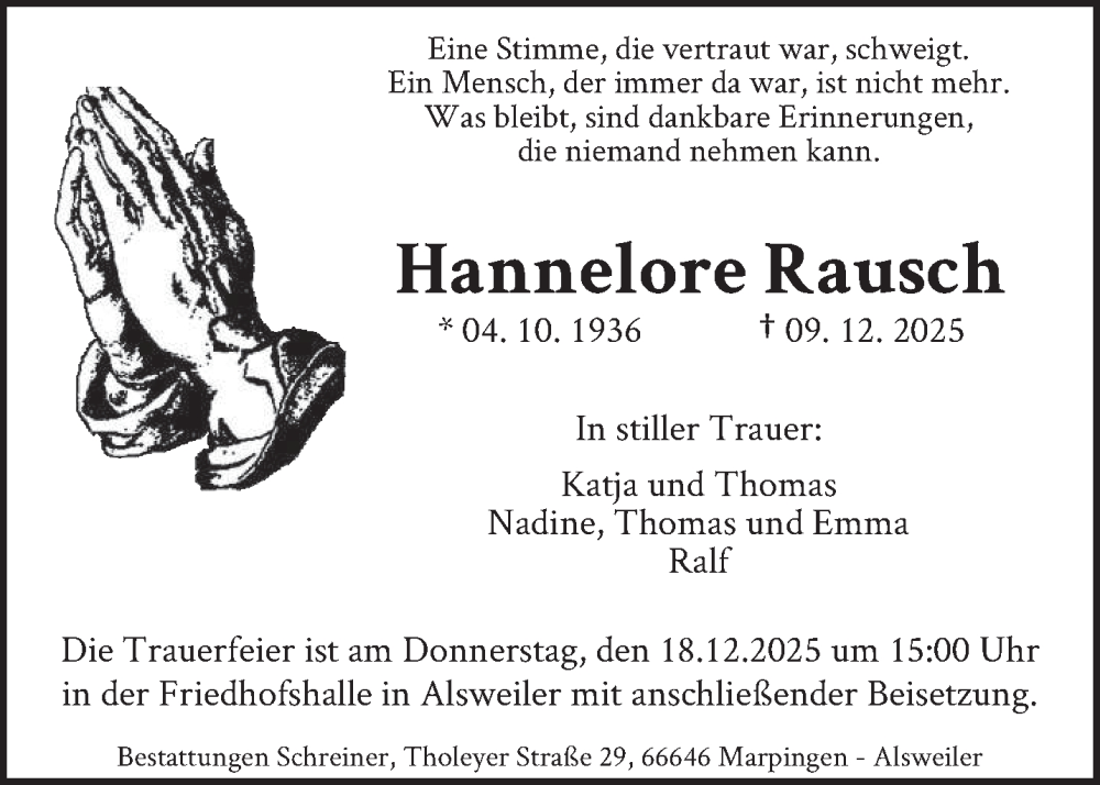 Hier finden Sie alle Traueranzeigen aus der Zeitung, die bisher für Hannelore Rausch erschienen sind. Weitere Traueranzeigen, die in der Zeitung erscheinen, werden hier ebenfalls aufgelistet