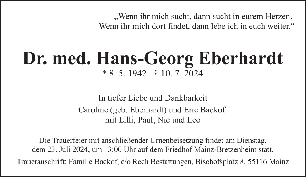 Hier finden Sie alle Traueranzeigen aus der Zeitung, die bisher für Hans-Georg Eberhardt erschienen sind. Weitere Traueranzeigen, die in der Zeitung erscheinen, werden hier ebenfalls aufgelistet