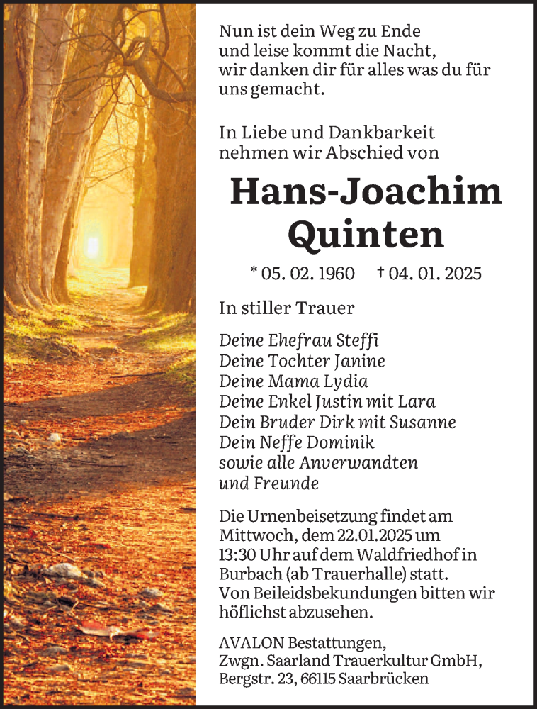 Hier finden Sie alle Traueranzeigen aus der Zeitung, die bisher für Hans-Joachim Quinten erschienen sind. Weitere Traueranzeigen, die in der Zeitung erscheinen, werden hier ebenfalls aufgelistet