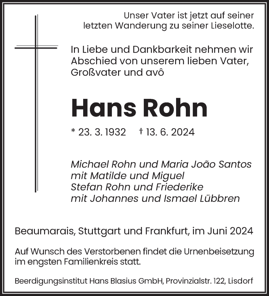 Hier finden Sie alle Traueranzeigen aus der Zeitung, die bisher für Hans Rohn erschienen sind. Weitere Traueranzeigen, die in der Zeitung erscheinen, werden hier ebenfalls aufgelistet