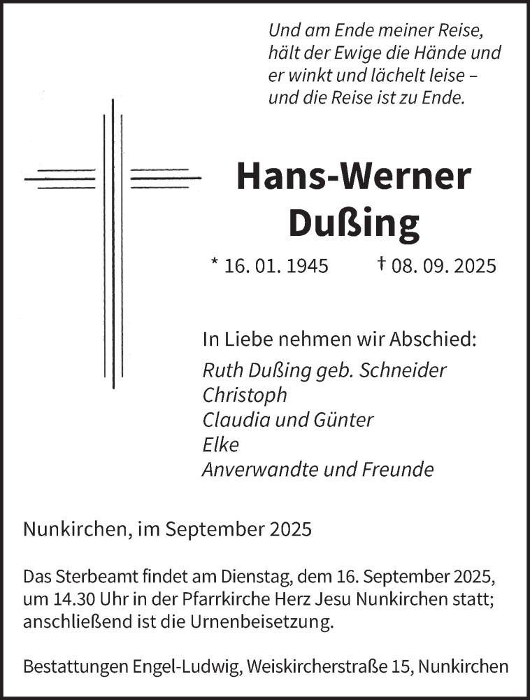 Hier finden Sie alle Traueranzeigen aus der Zeitung, die bisher für Hans-Werner Dußing erschienen sind. Weitere Traueranzeigen, die in der Zeitung erscheinen, werden hier ebenfalls aufgelistet
